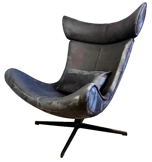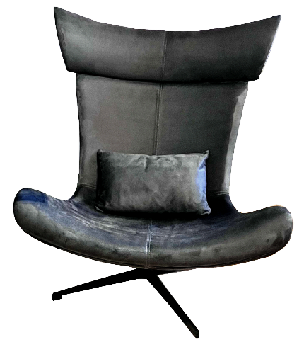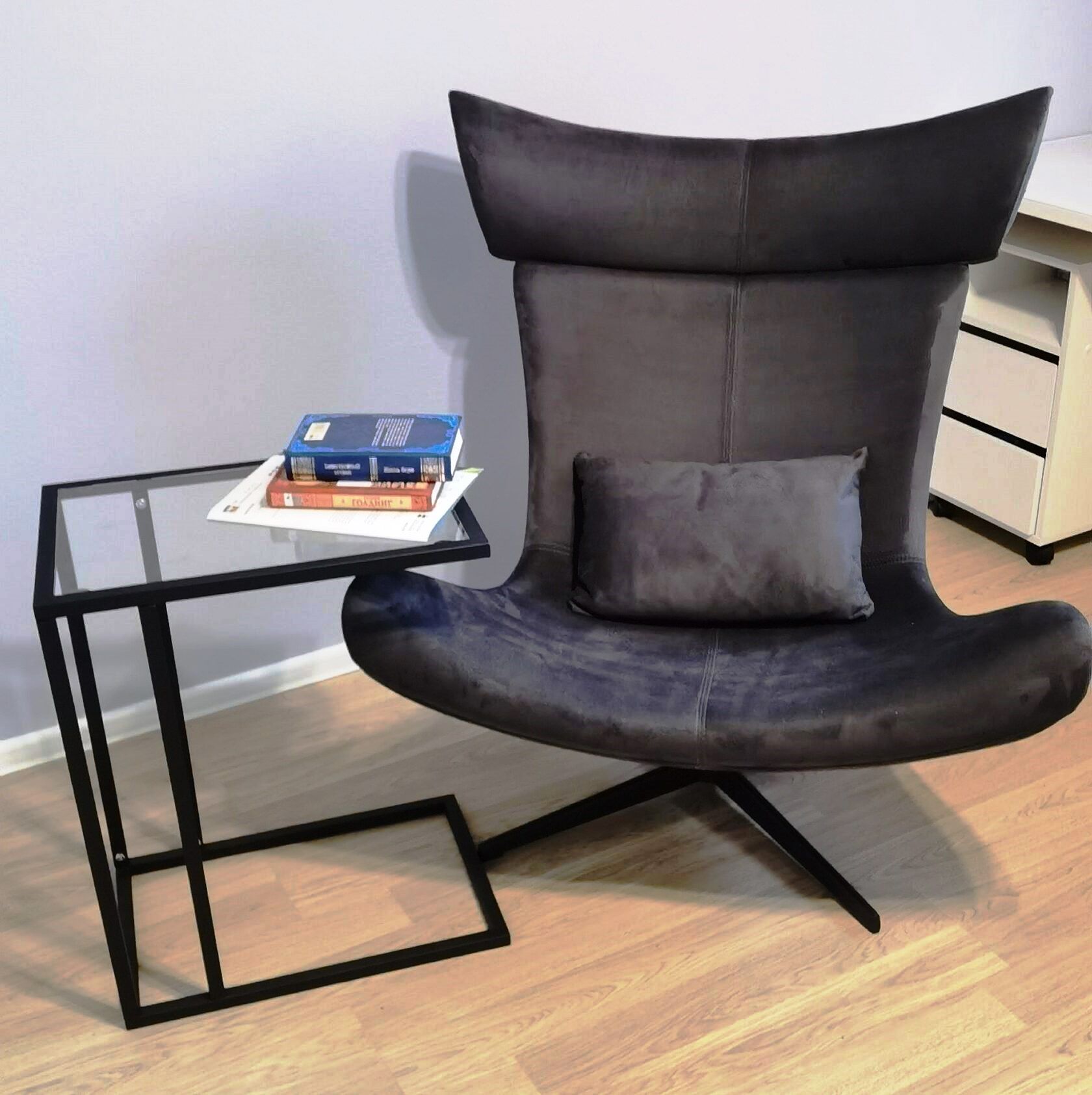 Дизайнерское вращающееся кресло в комплекте с мягкой подушкой в цвет кресла.‹br /›Материал кресла и подушки: искусственная замша цвета графит‹br /›Сиденье и спинка: высокоэластичный формованный пенополиуретан на прочном гнутом каркасе.‹br /›Опора: четырехлучевая сталь с покраской черного цвета, 60*60 см.‹br /›Глубина и ширина посадки сиденья: 55*65 см.‹br /›Под заказ: любой материал и цвет.‹br /›Срок изготовления и доставки - 2 месяца.
