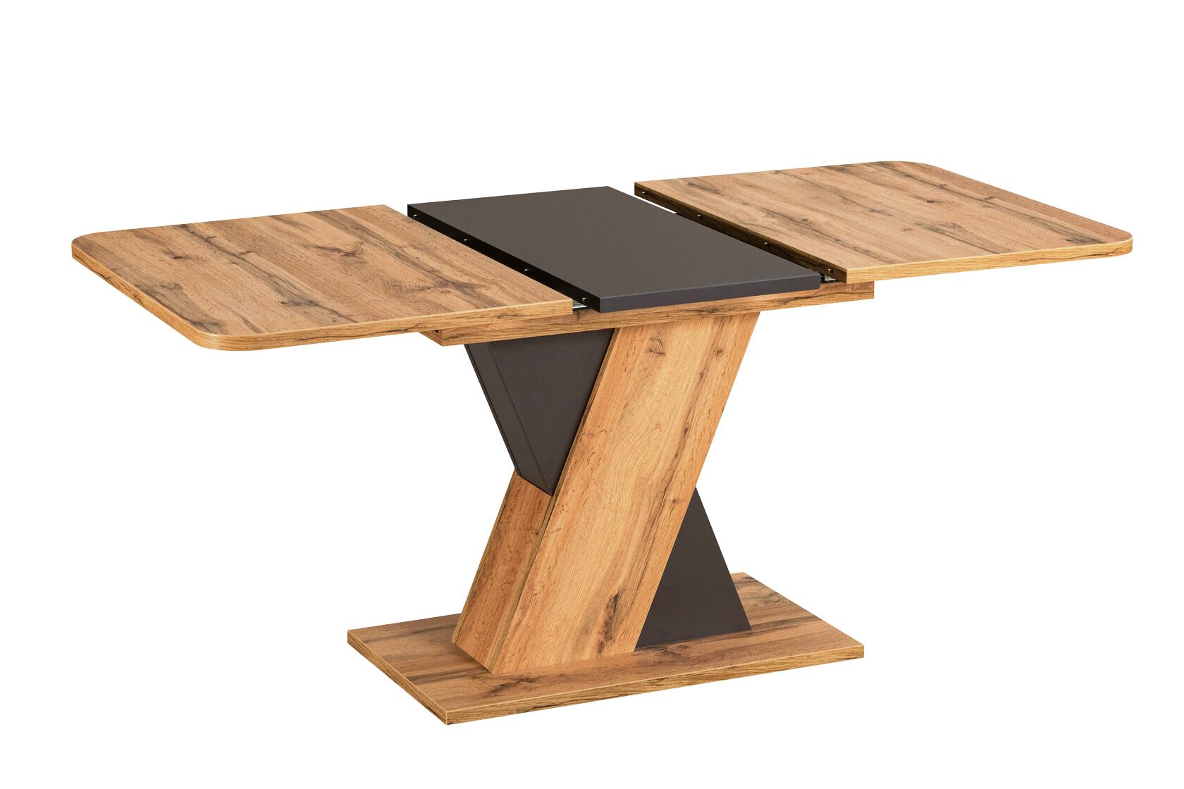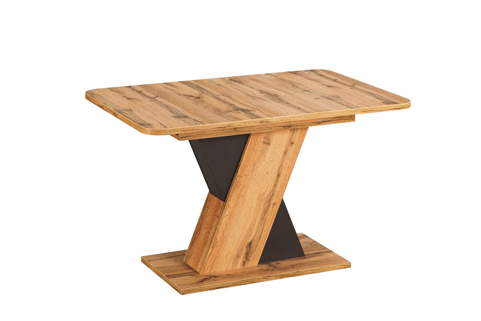 Прямоугольная столешница со скругленными углами длиной 120 см и шириной 80 см выполнена из высококачественного ЛДСП с утолщенной 2,5 мм кромкой ABC.‹br /›Стол имеет синхронный механизм раздвижения и замок фиксации. Вкладка, благодаря которой столешница увеличивается с 120 см. до 160 см., хранится внутри. Фактурный древесный декор внесет в интерьер гостиной или кухни природную нотку и теплоту. ‹br /›Стол полностью разобран, упакован в две коробки, легко транспортируется. Инструкция по сборке прилагается.