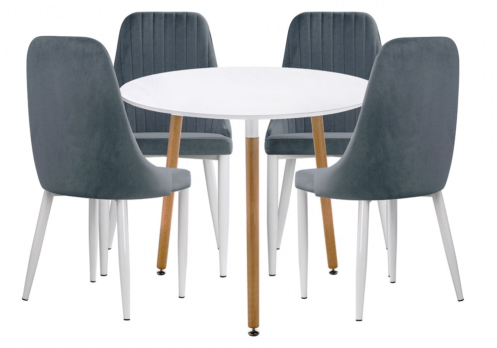 Материал каркаса стола: массив бука. Материал каркаса - Металл / массив бука; Материал сиденья - Велюр; Материал ножек - Металл / массив бука; Материал столешницы - МДФ; Материал обивки - Велюр; Цвет каркаса - Натуральный / белый; Цвет сиденья - Серый; Цвет ножек - Натуральный / белый; Цвет столешницы - Белый; Цвет обивки - Серый; Ширина сиденья - 44; Глубина сиденья - 44; Высота сиденья - 47; Длина стола - 90; Ширина стола - 90; Высота стола - 73; Ширина стула - 47; Глубина стула - 57; Высота стула - 89;