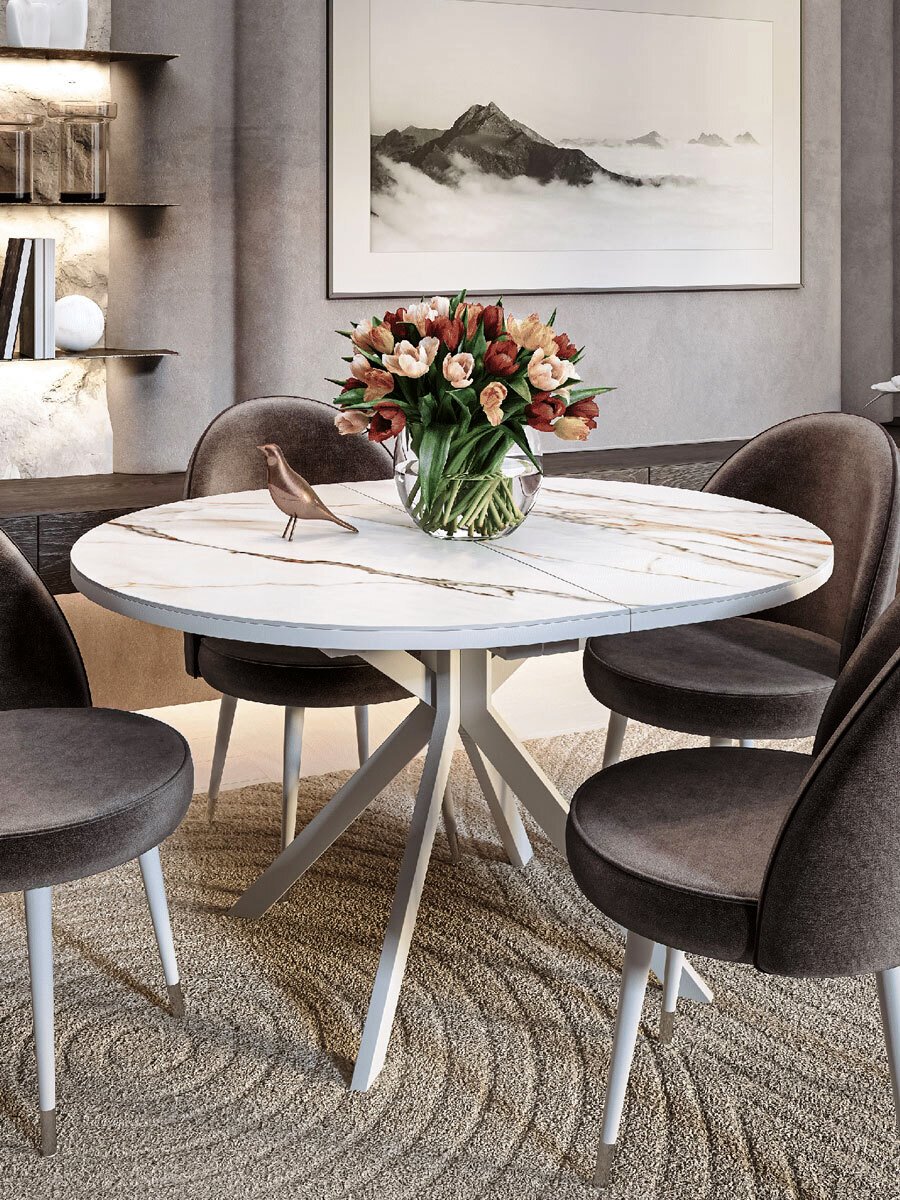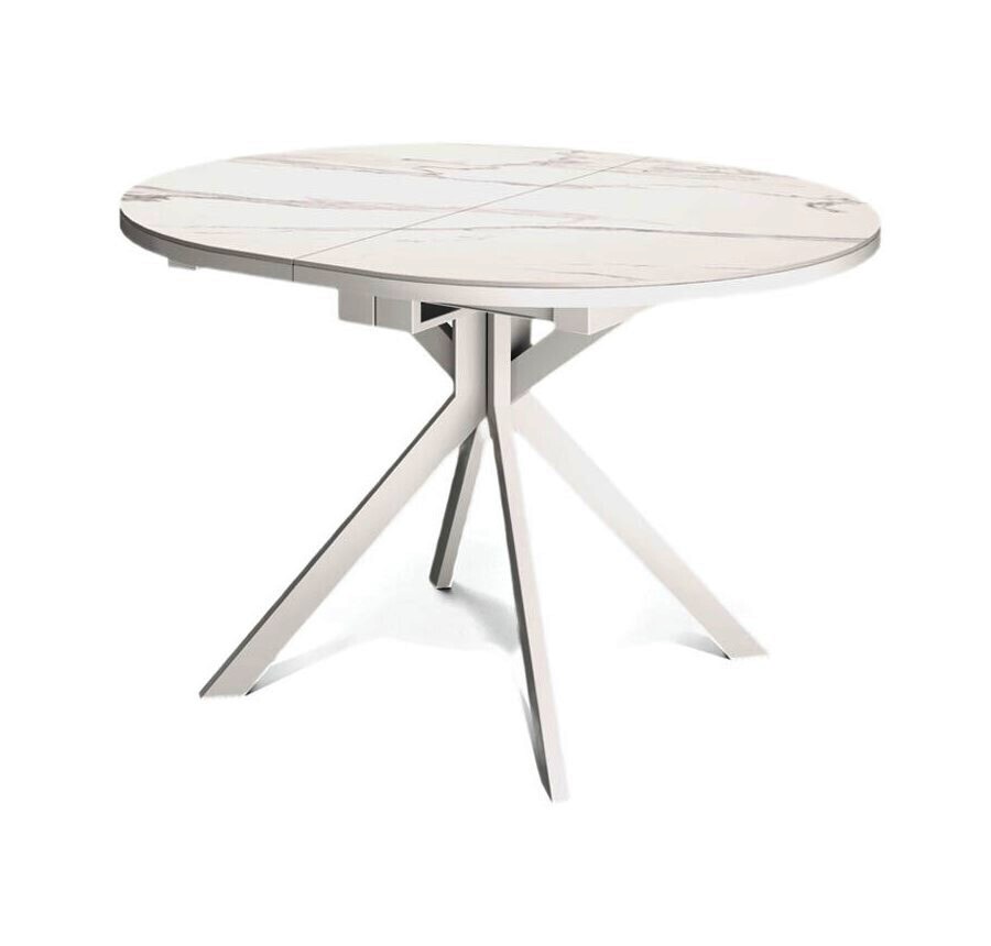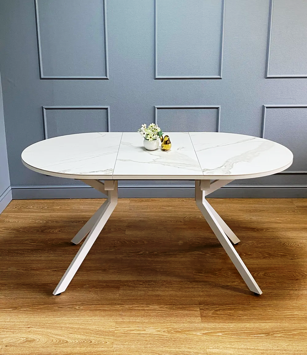Стол Avilon: столешница - керамика мрамор белый, опоры - металл белый.‹br /›‹br /›Телескопический механизм раскладки: столешница раскладывается вместе с опорами.‹br /›Опоры стола в разложенном виде не мешают сидеть, позволяют сделать большую вставку и, главное, столешница в разложенном состоянии так же крепка и надежна, как и в сложенном, тогда как обычно раскладка стола уменьшает устойчивость столешницы к нагрузкам из-за большего плеча‹br /›Материал столешницы - керамика на подложке из ЛДСП 18 мм. ‹br /›Опоры стола выполнены из стального профиля размером 60*30 мм, что гарантирует их надёжность и устойчивость.‹br /›Такой стол станет оптимальным выбором для современной кухни благодаря своей функциональности, удобству и стильному дизайну.