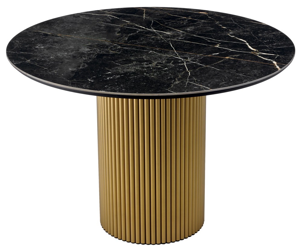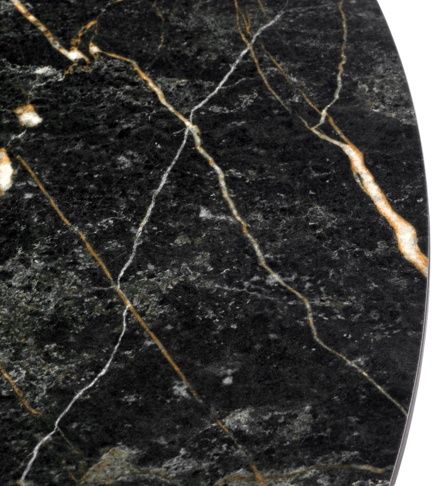 Стильный нераздвижной стол Aura – идеальное сочетание элегантности и функциональности. Стол Aura обладает глянцевой премиальной круглой столешницей из керамики, имитирующей чнрный мрамор, диаметром 110 см.