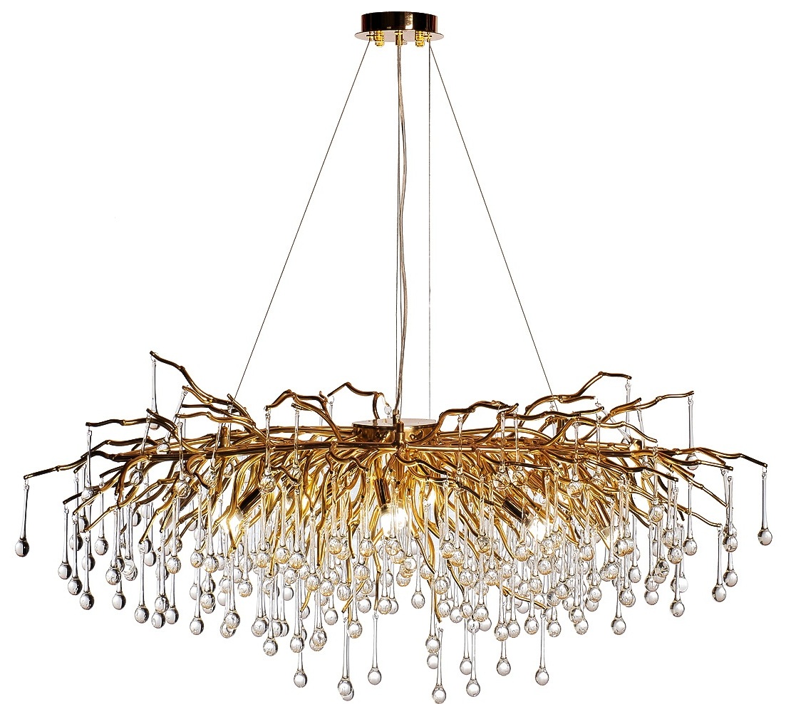 Эта люстра - воплощение элегантности и природной красоты. Золотистое основание напоминает изящные ветви дерева, с которых свисают прозрачные капли, создавая эффект утренней росы. Каждый элемент выполнен с высокой точностью, что придаёт люстре уникальный и...