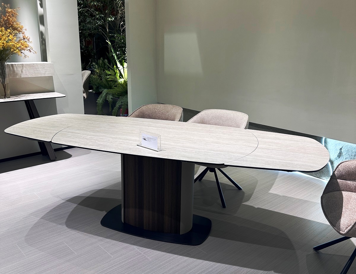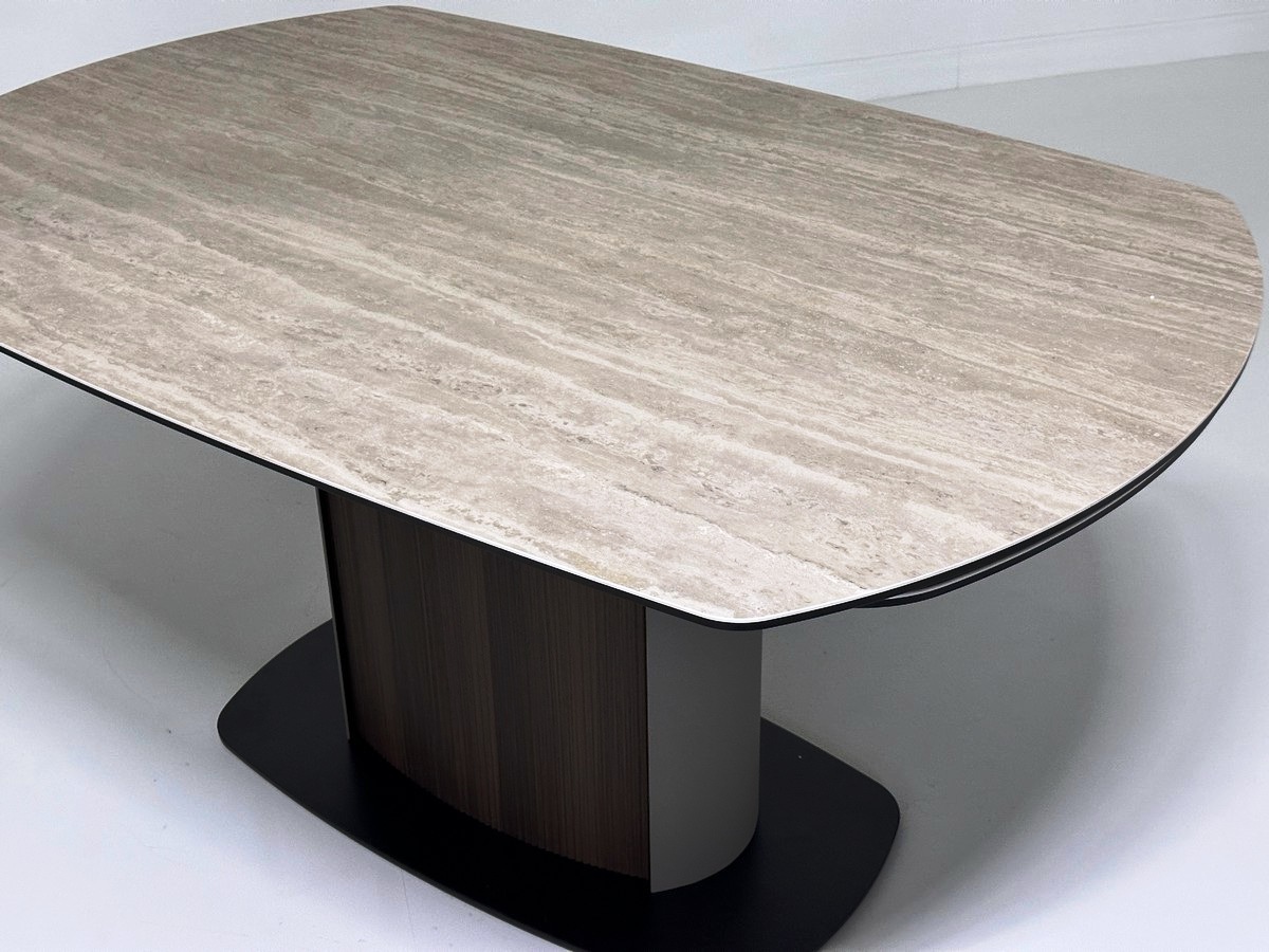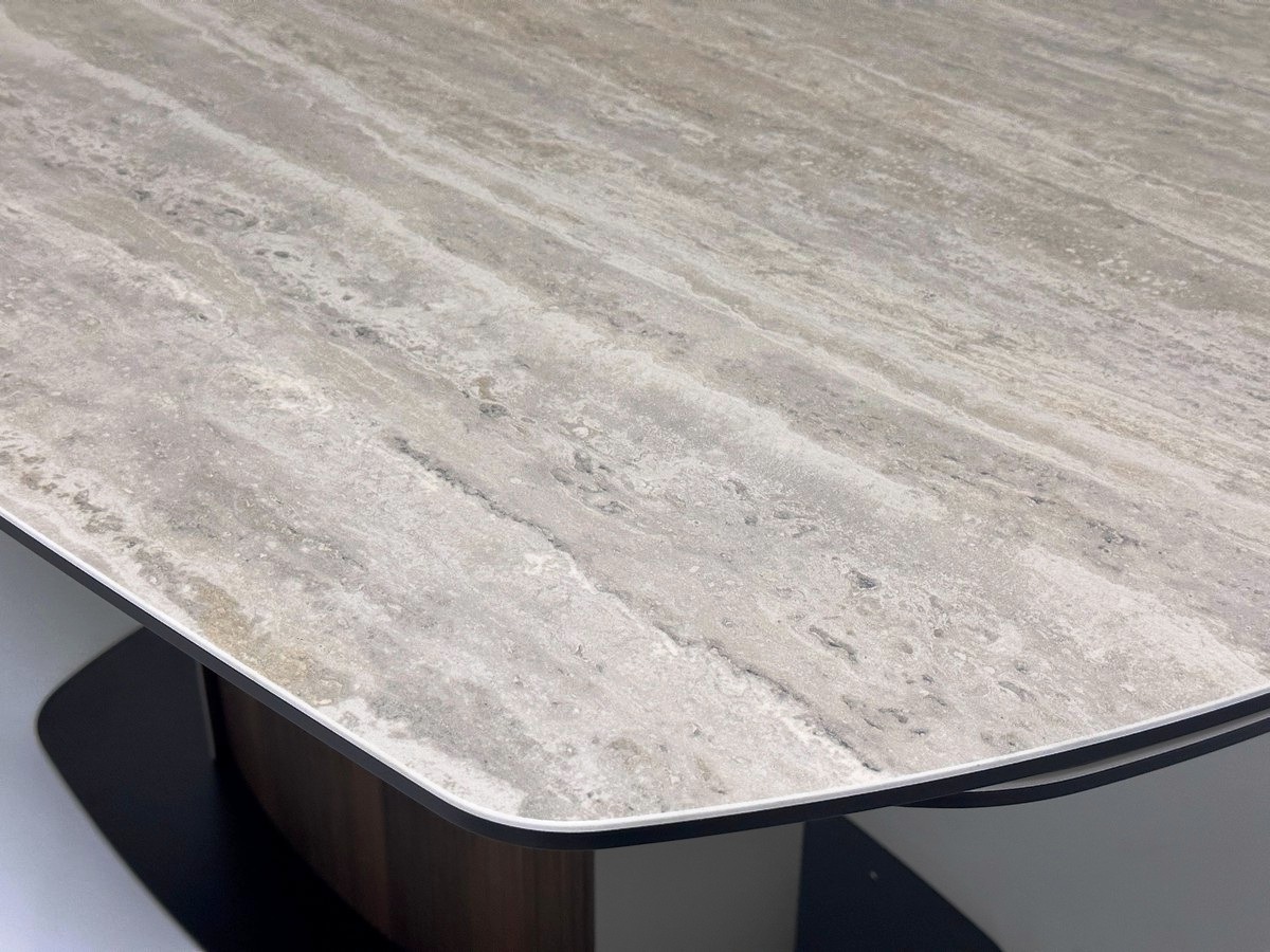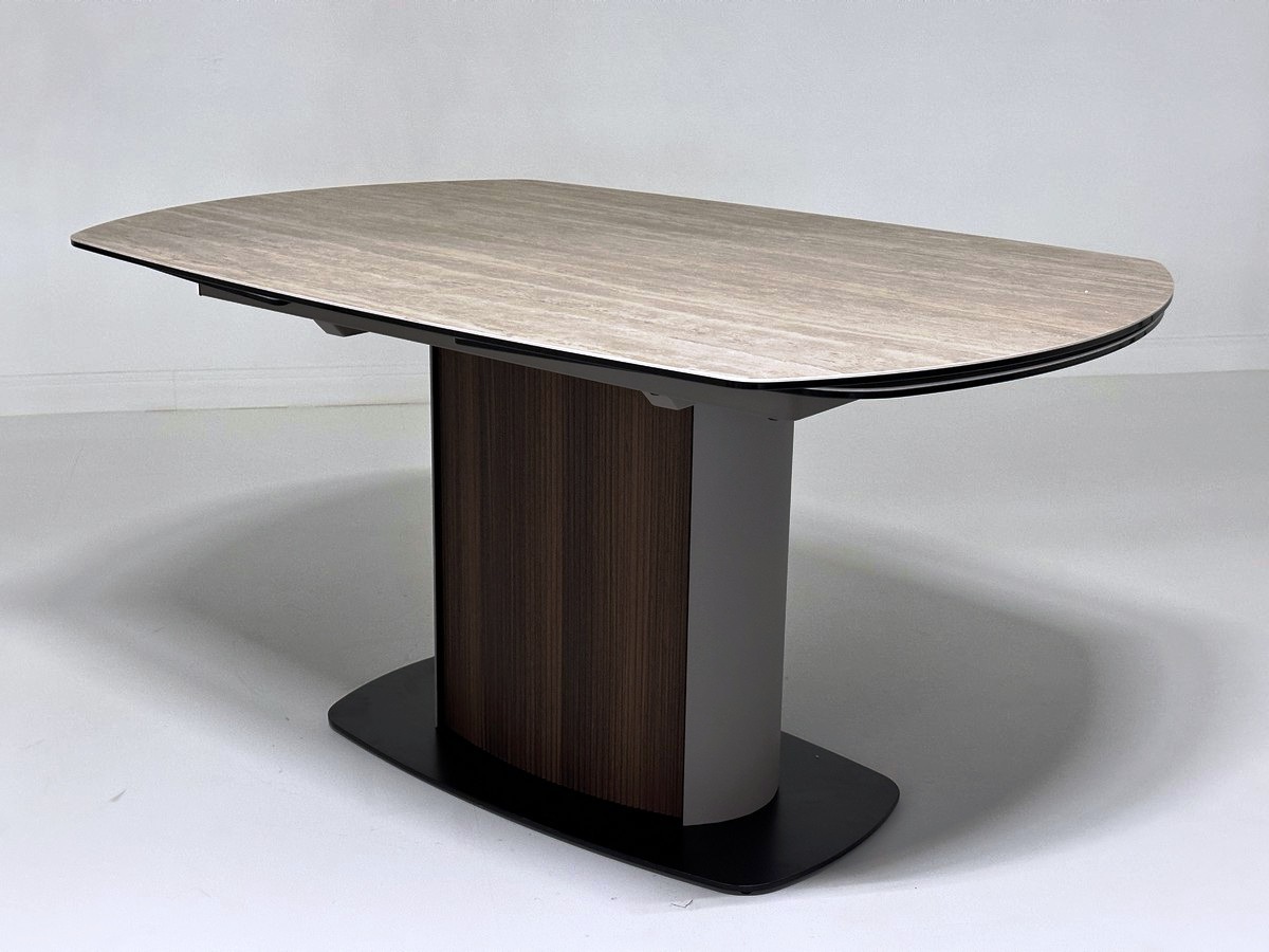 ‹h2›Стол DAGFINN 150 с матовой итальянской керамической столешницей на стекле‹/h2›‹p›Описание модели:‹/p›‹ul›‹li›ротационная (поворотная) система раскладывания позволяет увеличить длину столешницы до 240 см в одно действие при необходимости;‹/li›‹li›рисунок вставки может не совпадать и не являться продолжением рисунка основной столешницы;‹/li›‹li›керамическая столешница матовая, не впитывающая загрязнения, термостойкая, толщина 11 мм (3 мм испанская керамика + 8 мм закаленное стекло);‹/li›‹li›подстолье - металл светло-кофейного цвета с декоративными рифлеными панелями в цвете орех.‹/li›‹li›основание - металл, цвет – чёрный.‹/li›‹li›Упакован в 3 коробки.‹/li›‹/ul›