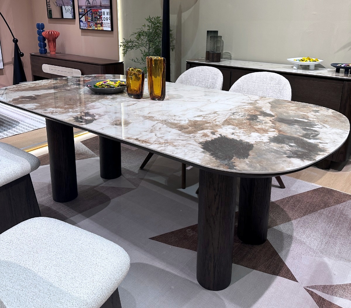 Изысканный обеденный стол с глянцевой мраморной столешницей и деревянными опорами — стильный выбор для интерьера в современном или классическом стиле. Натуральные оттенки, выразительный рисунок камня и уют тёплого дерева создают атмосферу уюта и гармонии.